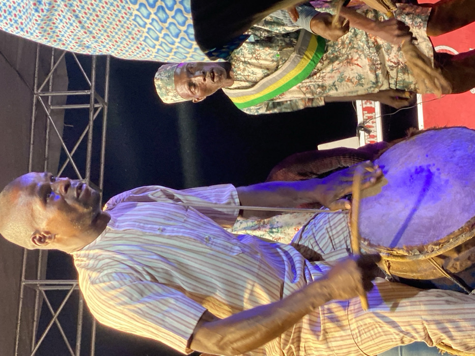 Two men stand on a stage. One is playing a large drum with a wooden stick. He wears a striped shirt. The second man is in the background wearing a colorful patterned garment with a green and yellow sash. The stage has metal framework. A fabric with geometric patterns is seen above the two men.