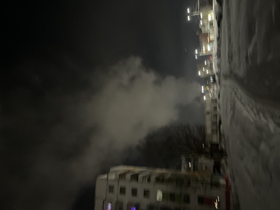 A nighttime street scene is depicted, with a building illuminated in the foreground. A cloud of smoke or steam hangs in the air. Street lights line the background of the image. A patch of snow covers a portion of the right side, obscuring some details. The image is blurred, creating a sense of motion and indistinctness.