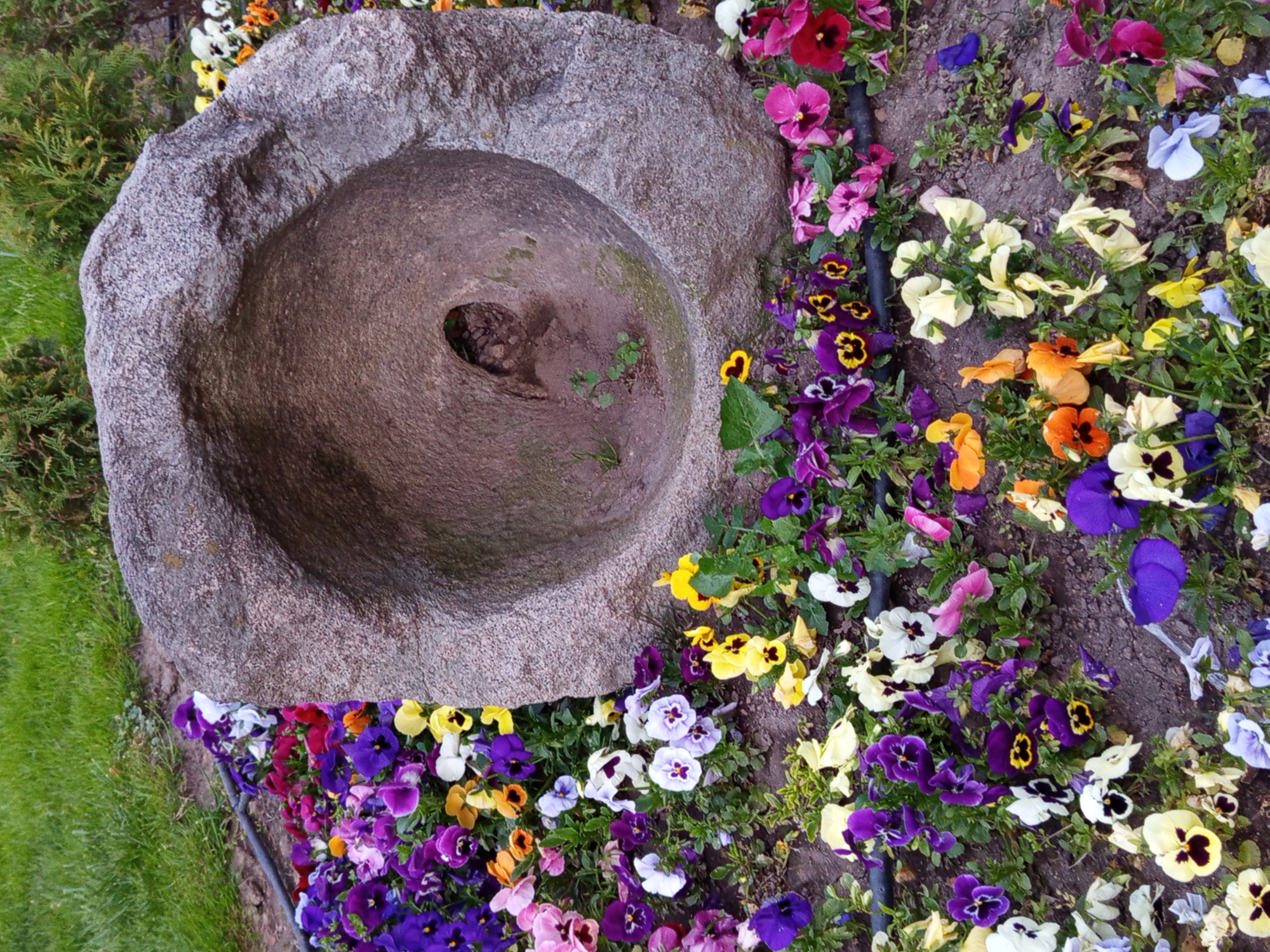 - "A high-angle, eye-level shot shows a stone bowl-shaped structure situated in a flower bed" by FM-EuFl13, licensed under CC BY 4.0