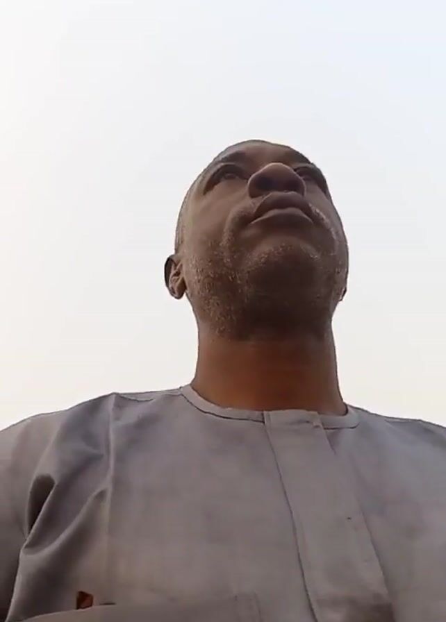 A man with a graying beard and mustache, wearing a gray shirt, looks upwards while the camera is held at a low angle. The background is a light gray sky. A telephone pole with wires is briefly visible in the background.