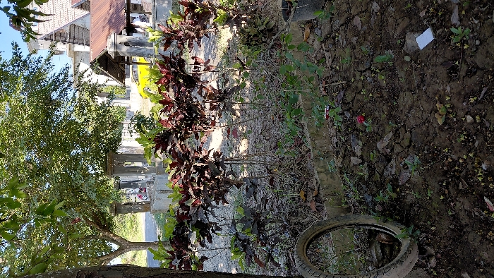 The image depicts an outdoor scene in Blangpha, Indonesia, under clear daylight conditions. In the immediate foreground, a dirt and gravel ground surface is present, exhibiting patches of dry, cracked soil and sparse green vegetation. A worn bicycle tire with a visible tread pattern lies on its side on the left, partially obscured by the soil. A single red flower bud is situated on the ground toward the center-right, and a small, rectangular white piece of debris is visible further right. Midground elements include a low concrete planter box or wall running horizontally across the frame. Behind this, a row of dark-leafed ornamental plants, possibly crotons, displays both green and reddish-brown foliage. Beyond these plants, a series of four light-colored, weathered concrete or stone pillars with decorative tops are arranged. Behind these pillars, a dirt road or open area is visible. A red scooter is partially discernible behind the left-most pillar, and a bright yellow vehicle, likely a car, is visible behind the right-center pillars. The background features lush green foliage from several trees, with a large tree trunk on the far left. On the right, a distinctive building complex is visible. This includes an open-sided structure with a reddish-brown corrugated metal roof supported by pillars, and behind it, a more substantial white or light-colored building with ornate, multi-tiered architecture, possibly a mosque or a traditional Indonesian structure. The sky above is clear and blue. No individuals are visible in the scene.