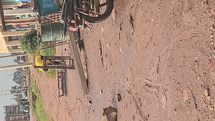 The image depicts a roadside scene in Chevaywa ward, Kenya. The foreground consists of an unpaved, reddish-brown dirt surface extensively marked by tire tracks and foot impressions. Scattered small stones and pieces of debris are visible on the ground. A large, irregularly shaped rock lies on the left side of the frame. The rear wheel, muffler, and taillight of a black motorcycle are partially visible on the far right. A long, light-colored wooden plank rests diagonally across the mid-ground. In the mid-ground, a male individual wearing a yellow long-sleeved shirt and dark trousers is bent over, engaged in metalworking. He is operating a power tool, likely a grinder or cutter, on a dark metal frame structure. Several other metal frame components, appearing to be incomplete furniture pieces, are scattered on the ground around him. To his right, a large, upright, dark green metal barrel is present. Behind this activity, a single-story building with a beige facade and blue accents is visible. Several individuals are standing near its entrance. A small, dense green bush grows in front of the building. The background shows a wider unpaved road with a visible concrete culvert. Multiple vehicles, including cars, motorcycles, a tuk-tuk, and a truck, are in motion. Several pedestrians are also visible on the roadside. Utility poles with power lines extend into the distance. Additional buildings and a line of trees are discernible in the far background under a hazy sky.