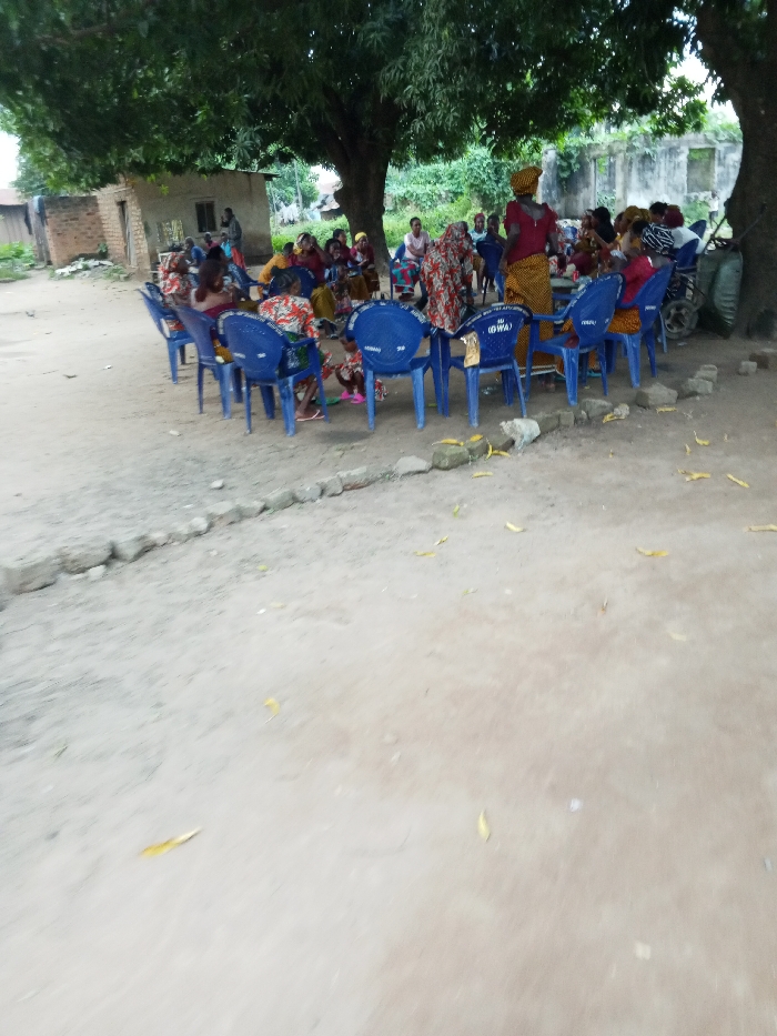 An outdoor gathering is depicted in Markurdi, Nigeria, beneath the canopy of large trees