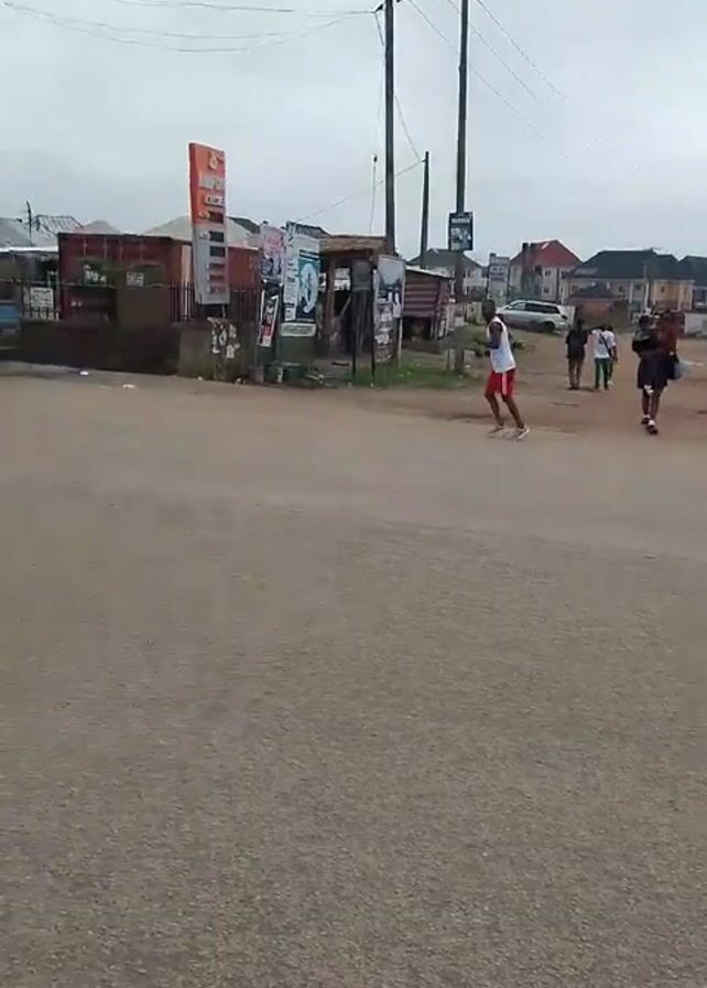 street scene with a person running in the background. The runner is wearing white on top and red bottoms. Other people are walking in the same general area. There are buildings and utility poles, and at least one motorized tricycle passes through the scene. The sky is overcast.