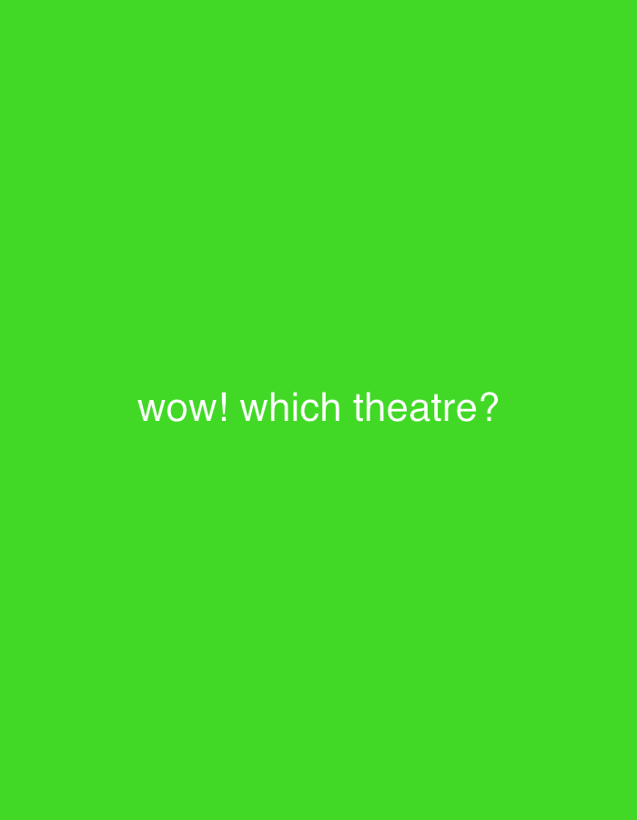 The image displays a solid chartreuse green background. Centered horizontally in the lower middle third of the frame, white sans-serif text reads: "wow! which theatre?". No other subjects, objects, people, actions, interactions, or discernible environmental details are present. The image does not depict any specific location in Como, Italy, or any theatre.