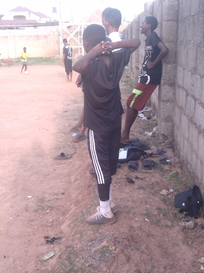 The scene is a dirt field, most likely a football field, in New Karu, Nigeria