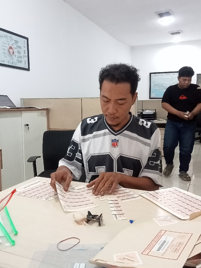 Two men are in a brightly lit office. The man closest to the camera is seated, wearing a sports jersey, and sorting through numerous small papers spread across a table. A small, metallic object and other miscellaneous items sit on the table. Another man stands in the background, wearing jeans and a dark t-shirt. Two framed pictures hang on the white walls behind them. The room appears to be a workspace.