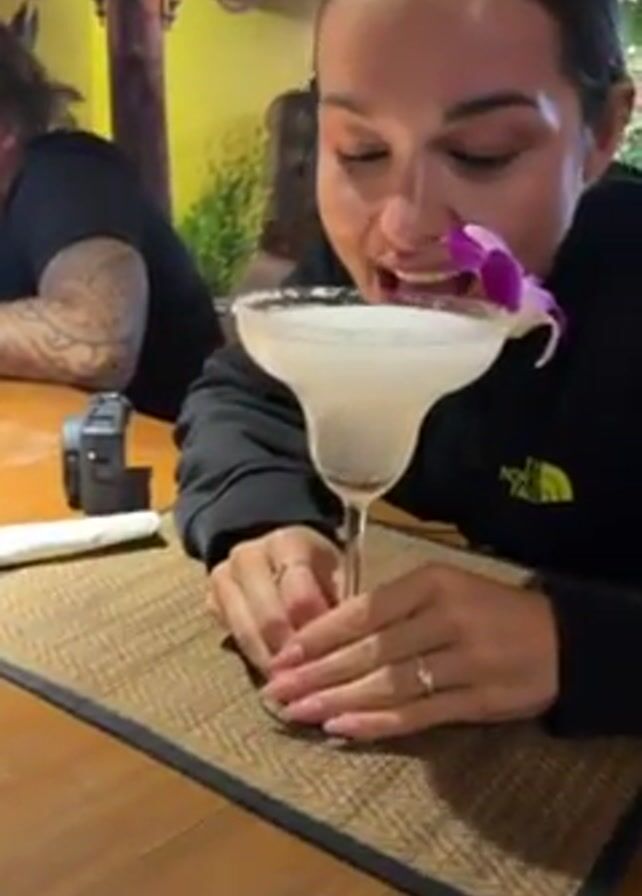 A woman is sitting at a wooden table with a woven place mat. She is smiling at the camera and holding a margarita glass. The rim of the glass is coated in salt, and there is a purple orchid attached to the side. The woman brings the glass up to her lips and takes a sip. Behind her is a man with tattoos on his arm who is looking at his phone. There are also other people and lighting fixtures visible in the background. The woman is wearing a black North Face sweatshirt and has a ring on her finger. The overall setting appears to be an outdoor dining area at night.