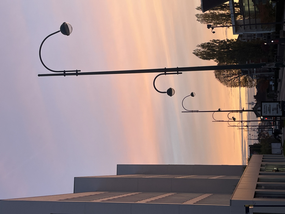 The image depicts an urban street scene in Villeneuve-d'Ascq, France, captured at dusk or sunset. The sky, which occupies the upper half of the frame, displays a prominent gradient of colors, transitioning from soft lavender and light blue at the zenith to vibrant pinks, oranges, and pale yellows near the horizon, indicative of a low sun angle. On the left side, a modern, multi-story building with a light-colored (likely white or very light gray) facade and numerous horizontal rows of rectangular windows dominates the foreground. Its lower section, at street level, features large glass panes suggesting storefronts or office entrances. A street sign, partially visible, is attached to this building. Along the right side, a linear arrangement of dark-colored streetlights extends into the distance, following the street's trajectory. Each streetlight consists of a tall, slender pole topped with a curved arm that supports a spherical, half-domed luminaire. The closest streetlight on the far right is partially cropped. The central feature of the midground is a paved road, lined by a sidewalk on the right. Several parked vehicles are visible along the street, and faint indications of traffic lights are present further down. A public notice board, partially obscured but displaying the text "AVIS D'ENQUÊTE PUBLIQUE" (Public Inquiry Notice), stands on the right-hand sidewalk. A few indistinct human figures, appearing to be pedestrians, are visible on the sidewalk and near the road. Behind the streetlights and notice board, a line of tall, slender deciduous trees with visible branches and sparse foliage (suggesting autumn or early spring) stands. In the far background, against the colorful horizon, the distinctive silhouette of the Hôtel de Ville de Villeneuve-d'Ascq, characterized by its unique multi-pointed architectural features, is clearly identifiable. No specific actions or interactions between individuals are discernible. The scene is illuminated by natural light from the setting sun, and artificial street lighting does not appear active.