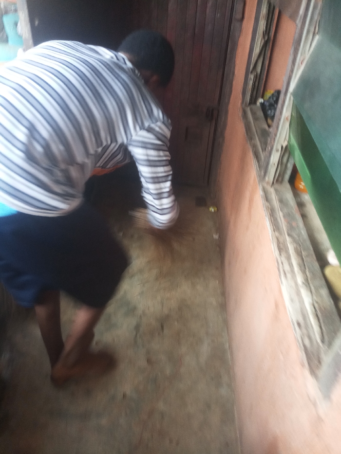 A person is depicted from a rear, elevated perspective, bent forward and actively sweeping a light-colored, possibly concrete or packed-earth, floor with a broom. The individual is wearing a long-sleeved shirt with horizontal white and dark stripes, dark blue shorts, and appears barefoot. Motion blur is evident around the broom, indicating movement. In the background to the left, a dark wooden door with horizontal paneling and visible hardware is present. To the right, a peach-colored wall runs parallel to a multi-paned wooden window frame. Dark, indistinct objects are visible within or behind the window's opening, and a portion of a green object is seen on the far right edge of the frame. A small, reflective yellow object lies on the floor near the base of the door. The scene occurs in an indoor or semi-enclosed residential space in the city of Unknown, Unknown.