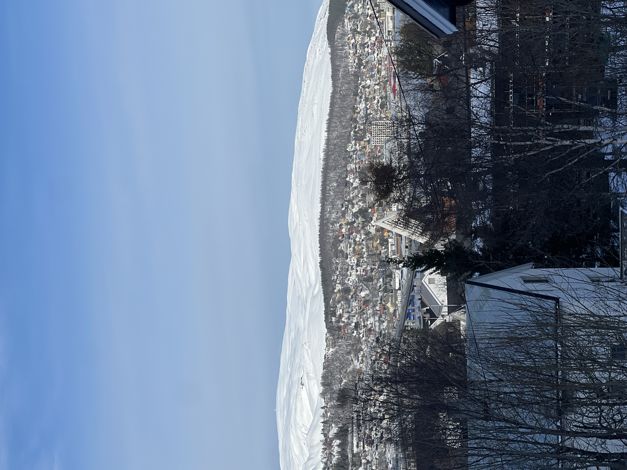 The image presents a panoramic winter cityscape of Tromsø, Norway, viewed from an elevated position, looking eastward. In the foreground, the upper section of a white residential building with a dark roofline is partially visible on the lower left. The angled dark roof edge of another structure is present on the lower right. The immediate foreground is densely filled with numerous bare deciduous trees, their fine branches silhouetted against the lighter midground; some show patches of white bark, indicative of birch. Snow covers the ground surfaces and some tree branches. The midground showcases a densely populated urban area, primarily residential, extending up snow-covered hillsides. Houses feature varied roof colors including red, white, blue, green, and grey, and are typically light-walled. Key landmarks are identifiable: the prominent white, angular, tent-like structure of the Arctic Cathedral (Tromsdalen Kirke) is visible slightly left of center, behind some foreground trees. The multi-span blue Tromsø Bridge crosses the Tromsøysundet strait in the mid-left, with small, indistinct vehicle shapes present on its deck. A dark body of water, likely the strait, is visible below the bridge and extending towards the right. A band of snow-dusted conifer trees forms a forest line below the distant mountains, interspersed with additional housing. The background is dominated by large, undulating, completely snow-covered mountains, with a small, indistinct structure (possibly an antenna or tower) visible on a peak in the upper left section of the range. The sky is clear, bright blue, and cloudless, exhibiting a slight gradient from darker blue at the zenith to a lighter hue near the horizon. No distinct human figures or specific actions are discernible. The scene depicts a clear, cold winter day.