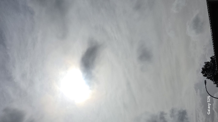 The image displays an overcast sky over Leudelange, Luxembourg. A bright, diffused light source, consistent with the sun, is visible through cloud cover in the upper-left quadrant, creating a localized glare. The sky is filled with a dense formation of grey and white clouds, with varying opacities and textures. In the lower-left portion of the frame, a section of a black street lamp, featuring a curved arm and light fixture, is partially visible. Immediately adjacent to the street lamp, the dark green foliage of a tree canopy is present. A dark, horizontal architectural element, consistent with a building's roofline, extends across the bottom edge of the frame. No individuals or discernible actions are depicted. The text "Galaxy S25" is overlaid in white in the bottom-left corner.