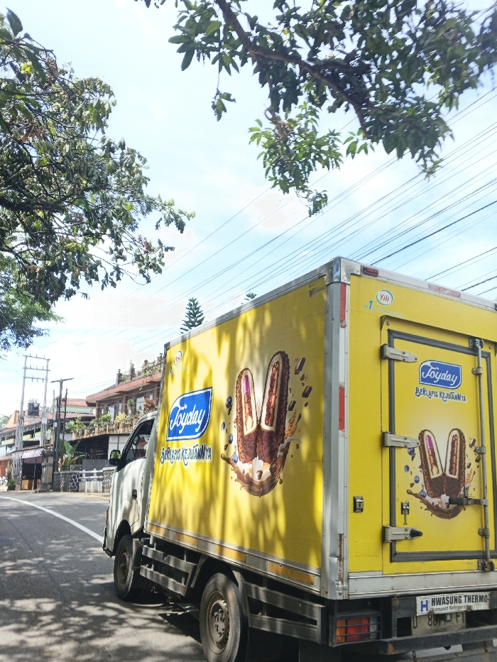 - "A yellow delivery truck for "Joyday" ice cream sits on an asphalt road under a partially cloudy sky" by FM-rmJRI3, licensed under CC BY 4.0