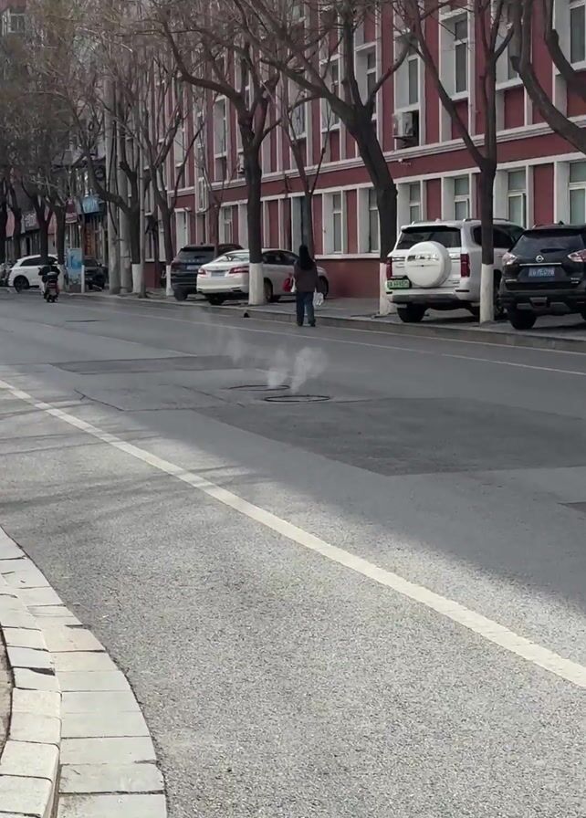 street with steam rising from a manhole in the middle of the road. A woman walks past the manhole on the sidewalk. Cars are parked on the side of the road. A person on a motor scooter drives past the camera. Buildings with a red facade and white window frames are visible in the background. Bare trees line the street.