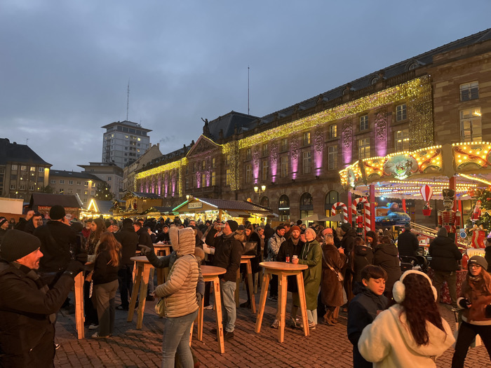 A crowded Christmas market scene unfolds at dusk. Numerous people are gathered around wooden tables, enjoying the festive atmosphere. Stalls with lights and decorations line the market. A carousel stands to the right, adding to the charm. Buildings adorned with illuminated garlands and purple lights frame the backdrop, with taller structures visible in the distance. The cobblestone ground contributes to the traditional market ambiance.