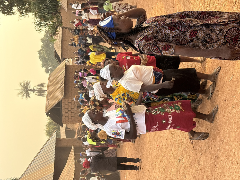 A crowd of people, predominantly women, stand outside in a rural setting. They are dressed in colorful and patterned clothing, many wearing head wraps. Buildings with corrugated metal roofs and brick or mud walls are visible in the background. A palm tree stands out against the hazy sky. The ground is sandy or dirt.