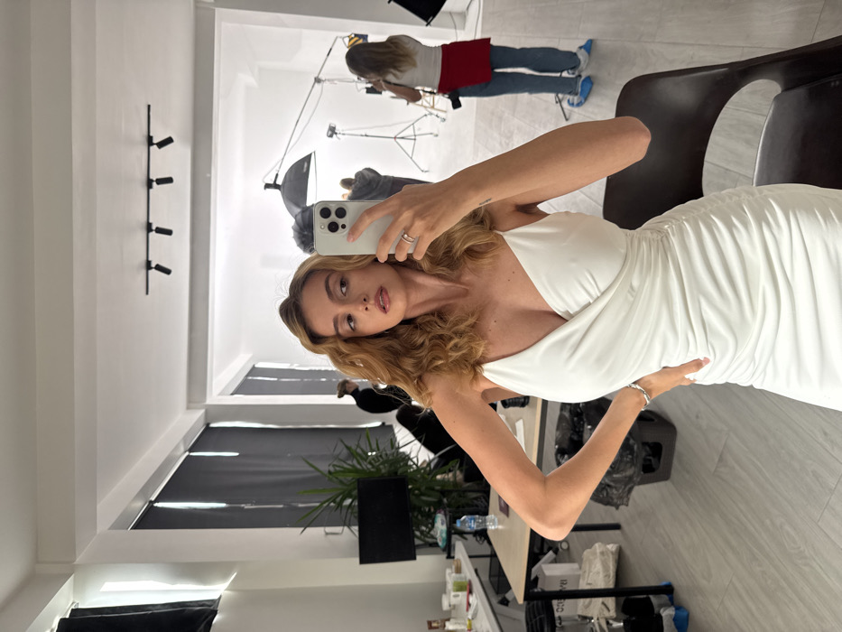 A woman with wavy blonde hair, wearing a white ruched spaghetti-strap dress, captures a mirror selfie using a light-colored iPhone, held in her left hand, which displays a ring on the ring finger