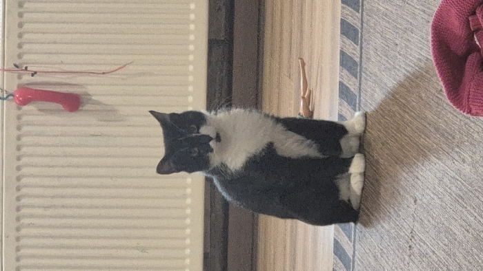 - "An indoor scene in Melle, Belgium, depicts a black and white tuxedo cat seated upright on a light-toned wooden floor, facing forward" by FM-IS3x72, licensed under CC BY 4.0