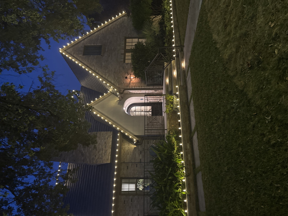 A two-story brick house at night has strings of lights outlining the roof and pathway. The house has a gabled roof and arched entryway with wrought iron details. Landscaping includes a lawn, trees, and shrubbery. The sky is a deep blue, hinting at twilight. A pathway leads to the house entrance, illuminated by the decorative lights.