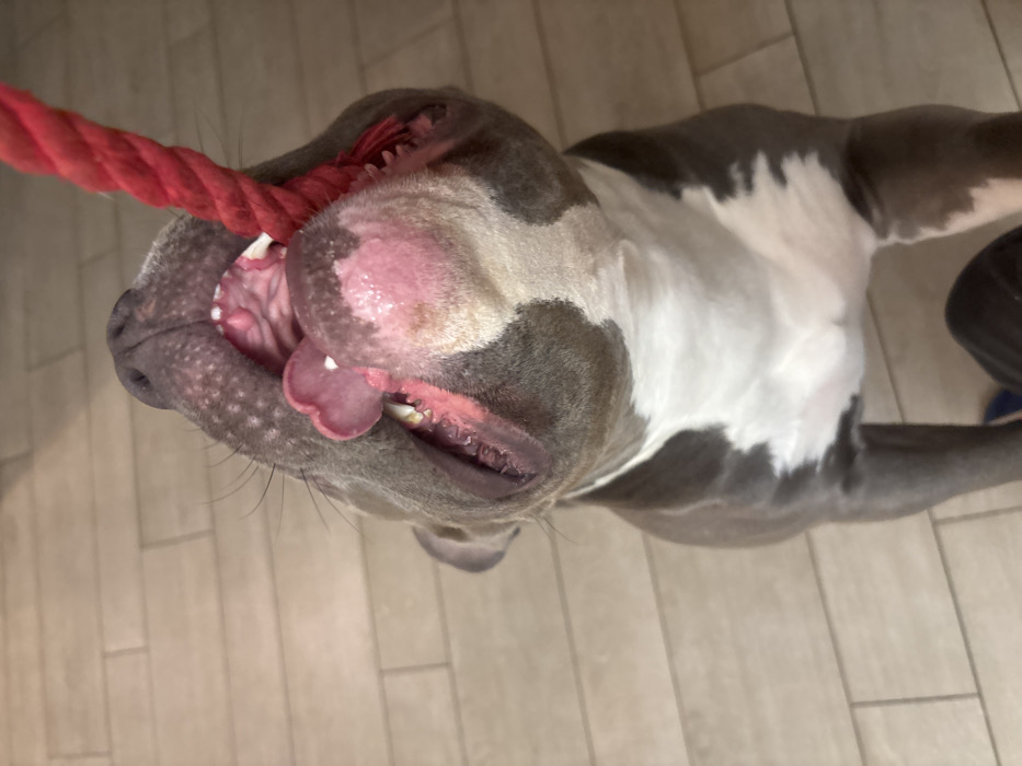 - "An upside-down view of a gray and white pit bull dog with a red rope toy in its mouth" by FM-rEJ0w2, licensed under CC BY 4.0