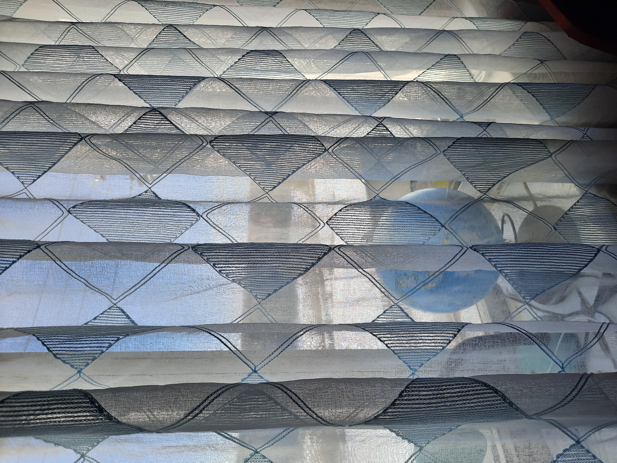 The image displays an indoor scene in Архангельское, Russia, looking outwards through a window. The foreground is dominated by sheer, translucent curtains, light-colored with a repeating geometric pattern of interconnected diamonds, some filled with vertical or diagonal stripes in shades of blue and gray. Behind the curtains, on a windowsill, a light blue globe with white landmasses is visible, partially obscured. Beyond the window, a winter landscape unfolds, featuring an expanse of snow-covered ground with a distant treeline or structures under a bright, clear sky. No individuals are present.