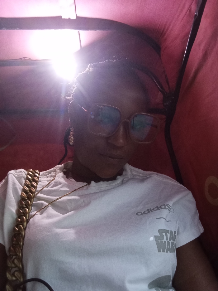 A person wears glasses and a white t-shirt with "Adidas" and "Star Wars" text. A gold chain strap is visible on their shoulder. They are indoors, possibly in a vehicle with a red interior, under a bright light.