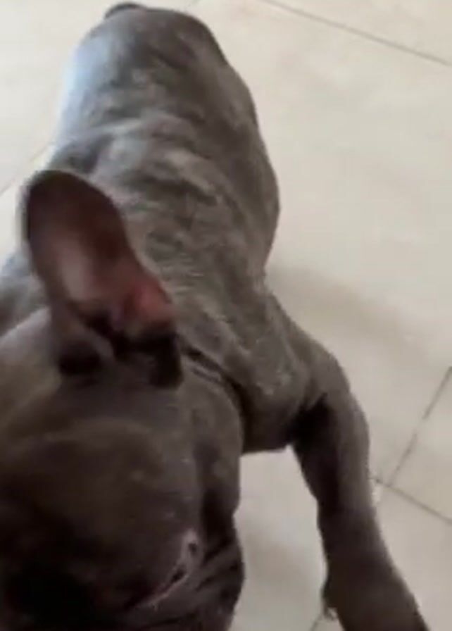 French Bulldog sitting on a white tiled floor. A person’s hand appears in the frame and the person says, "Dame la mano." The dog stands up and turns around. The person says "No, sentado." The dog sits. The person says, "Dame la mano."