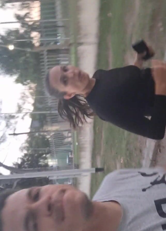 A selfie-style video shows two people on a path, the camera being held by a man in a gray Jordan t-shirt. The man is smiling as he films. Slightly ahead of him is a woman with her hair pulled back, wearing a black long-sleeved shirt. She appears to be speaking and gesturing with her hands, possibly holding a phone or small object. They are on a paved path with grass and trees to the side. A chain-link fence and some buildings are visible in the background. The lighting suggests it is late afternoon or early evening.