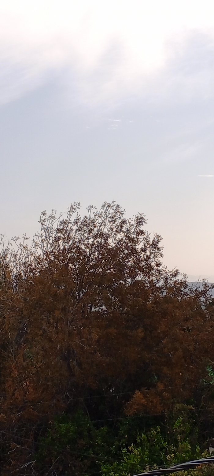 The image displays an outdoor scene in the city of Unknown, Unknown. The upper two-thirds of the frame consists of an overcast sky, transitioning from light blue-grey at the bottom to a brighter white toward the top, indicating diffuse light or a hidden light source. The lower portion of the image is dominated by a large tree with dense, predominantly russet and brown foliage, suggesting a deciduous species in autumn or a state of dormancy/stress. Bare branches are visible through the leaf clusters. Beneath this tree, a layer of vibrant green vegetation is present. Two thin, dark horizontal lines, consistent with utility wires, traverse the lower-middle section of the image, passing over the green foliage. Faint, indistinct topographical features are visible on the distant horizon line to the right. No human subjects or animals are present. The scene is static, captured during daytime hours under ambient lighting conditions.