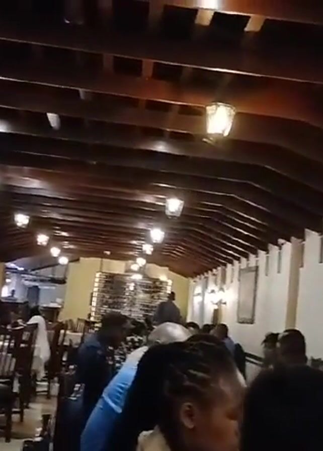 busy restaurant with a high wooden ceiling, illuminated by numerous hanging lamps. People are seated at tables, some dining, others engaged in conversation. Waiters are moving around, serving customers. The walls are decorated with paintings and sconces. The atmosphere appears lively and social.