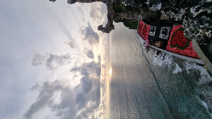 This image depicts a cliffside scene in Uluwatu, Indonesia, at what appears to be either sunrise or sunset