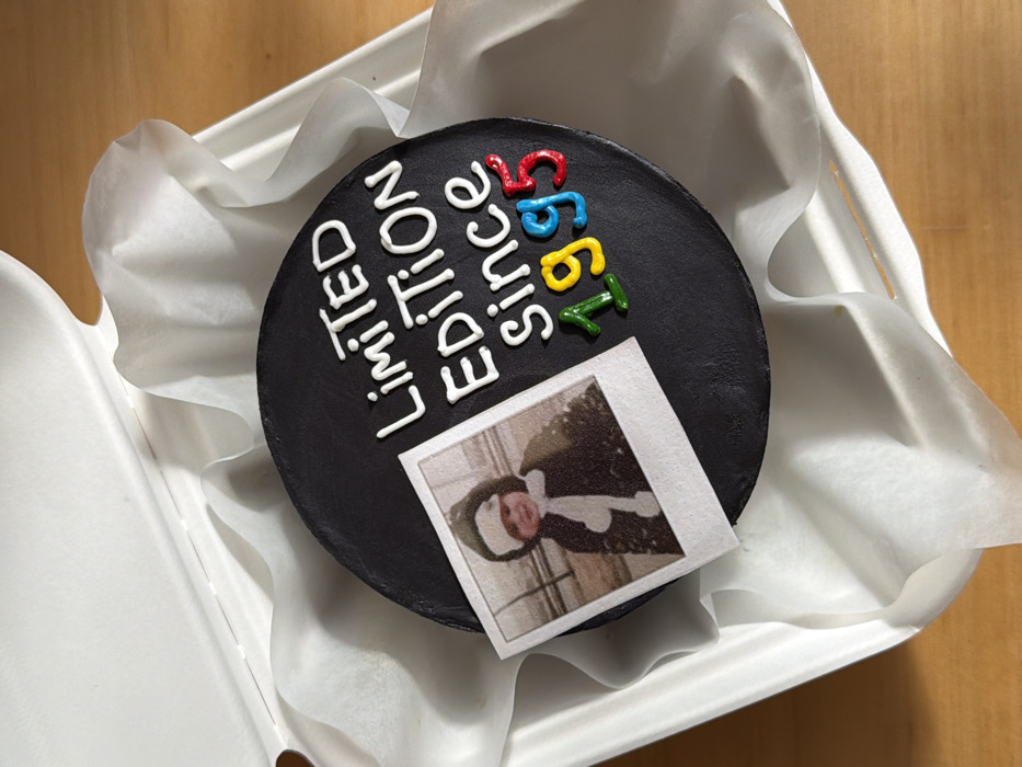 The image displays a small, round cake presented within an open white cardboard takeout box, resting on a light brown wooden surface. The cake features a dark gray or black frosted top. White icing spells "LIMITED EDITION since" in capital letters. Below this text, the year "1995" is depicted using individual colorful edible letters: a green '1', a yellow '9', a blue '9', and a red '5'. An edible print, designed to resemble a Polaroid photograph, is positioned on the left side of the cake. This print shows a smiling young child, possibly a toddler, wearing a dark coat, a white hat, and a white scarf, set against a blurry, light-colored background that suggests an outdoor, potentially snowy environment. The takeout box is lined with white, crumpled tissue paper that surrounds the cake. The wooden surface beneath the box exhibits a visible grain pattern. No individuals are present in the scene. The specific location within the city of Tel Aviv-Yafo, Israel, cannot be determined from the visual information provided.