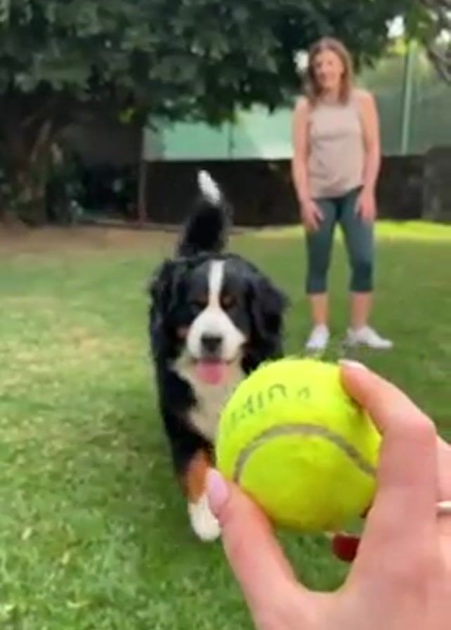 A point of view video shows a person holding a tennis ball and facing a Bernese Mountain Dog on a grassy lawn. A woman stands in the background near a fence and trees. The person throws the ball and the dog chases it, briefly disappearing from view as the camera focuses on the woman who prepares to catch the ball. The dog then reappears and lays down in front of the woman.