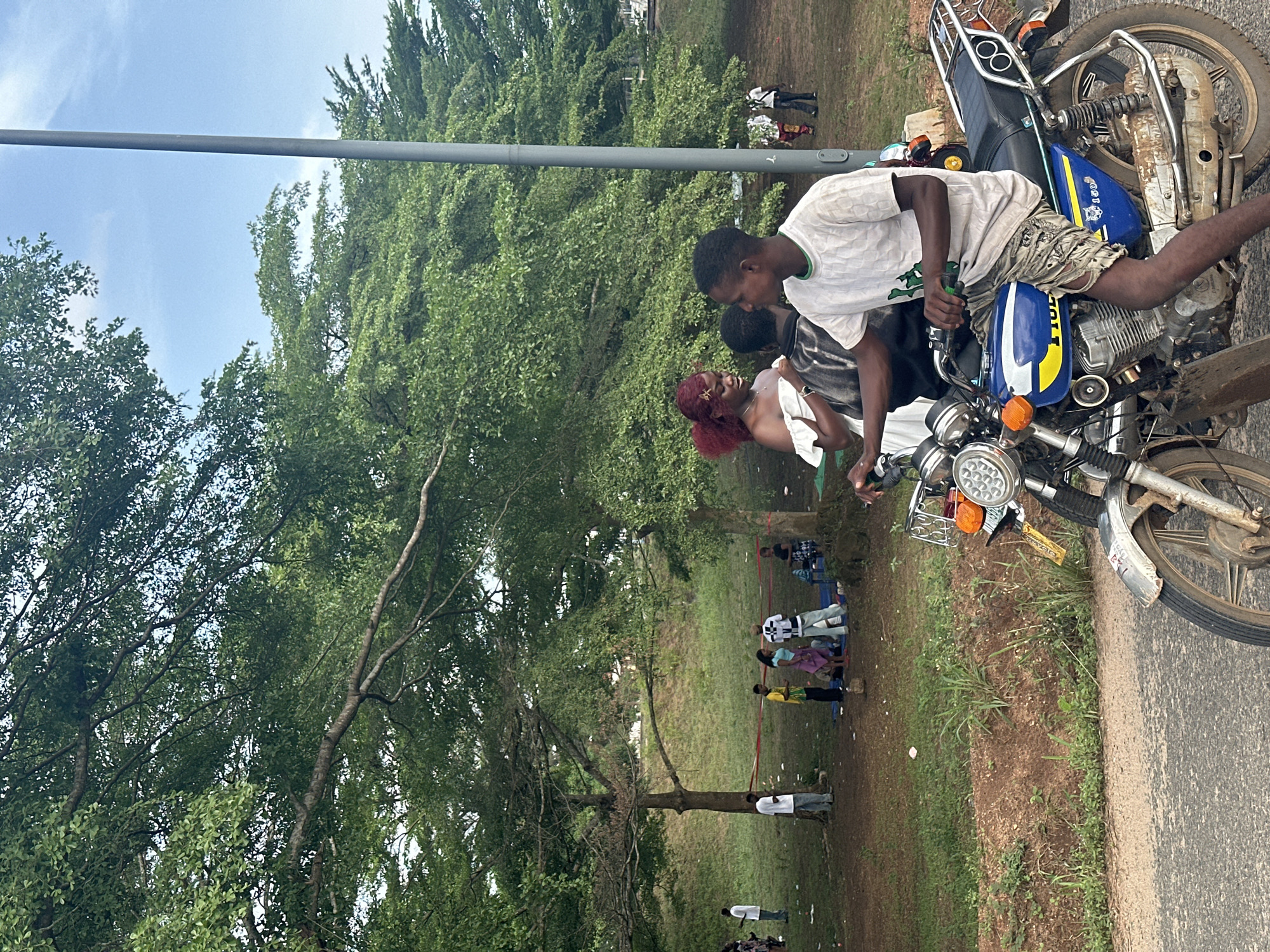group of people gathered in Ihiagwa, Nigeria. A man is sitting on a motorcycle parked on the side of a road. Another woman stands beside the motorcycle with red hair. Trees, a pole, and a group of people can be seen in the background. The motorcycle is old and dusty. The setting appears to be a casual outdoor gathering.