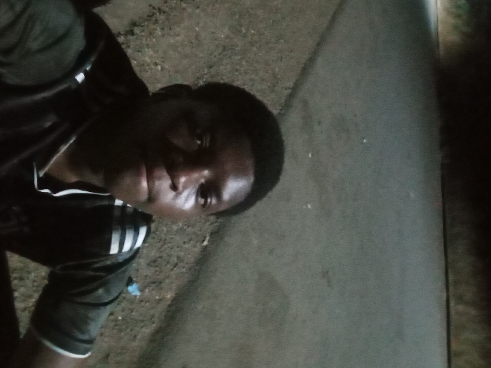 A close-up, dimly lit, rotated view of a person with dark hair and complexion. The individual wears a dark-colored athletic garment featuring white stripes. The background consists of a concrete surface and a darkened area resembling foliage or shadows. The lighting highlights the person's face, casting shadows that accentuate their features. The photograph's angle is tilted, offering an unconventional perspective.