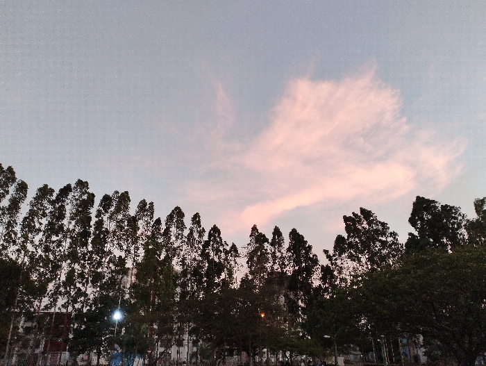 This image captures an outdoor scene in Guacara, Venezuela, during a low-light period, likely dusk or dawn. The upper portion of the frame features a pale blue-grey sky transitioning into soft pink hues, particularly prominent in a large, wispy cloud formation in the upper-right quadrant. A continuous line of tall, slender, dark-foliaged trees, possibly eucalyptus, forms a strong silhouette across the lower third of the image, obscuring much of the background. Behind these trees, indistinct structures or buildings are partially visible. Two artificial light sources are apparent within the tree line: a bright, white spherical light left of center, and a smaller, orange light further to the right. No individuals, specific actions, or interactions are discernible.