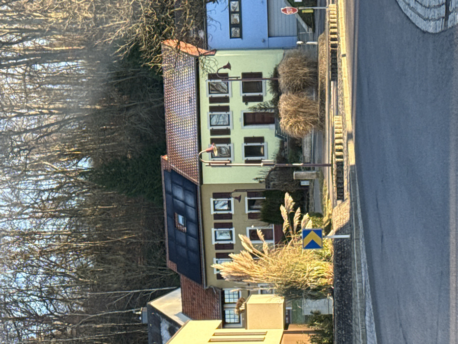 This image depicts a residential street scene in Niederanven, Luxembourg, under clear, bright conditions, likely morning or late afternoon given the directional sunlight. The foreground features an asphalt roadway with a curved edge leading to a paved median or traffic island. On the left side of this island, a large, tall clump of light-colored, feathery ornamental grass is prominently lit by direct sun, and a blue and yellow chevron sign indicating a right turn or curve is visible at its base. A dark-poled streetlight with a red-tinted lamp stands near the center of the island. On the right side of the island, two smaller clumps of dry, brownish ornamental grass are present. A red octagonal STOP sign is partially visible on the far right. Behind the street features, a row of residential buildings is visible. From left to right: a portion of a modern-looking light beige/yellow building, followed by a two-story house with a light brown-beige facade, a red tiled roof fitted with multiple dark rectangular solar panels and one skylight, and several windows with dark brown shutters. Adjacent to this is another two-story house, light yellow-green in color, with a red tiled roof (appearing lightly frosted or dusted), also featuring multiple windows with dark brown shutters and a dark wooden front door. To the far right, a section of a light blue building with a garage door and horizontal windows is visible. The background is dominated by a dense hillside forest composed primarily of leafless deciduous trees, suggesting a winter or early spring season. A single evergreen tree is discernible within the deciduous canopy. No individuals are visible in the scene.