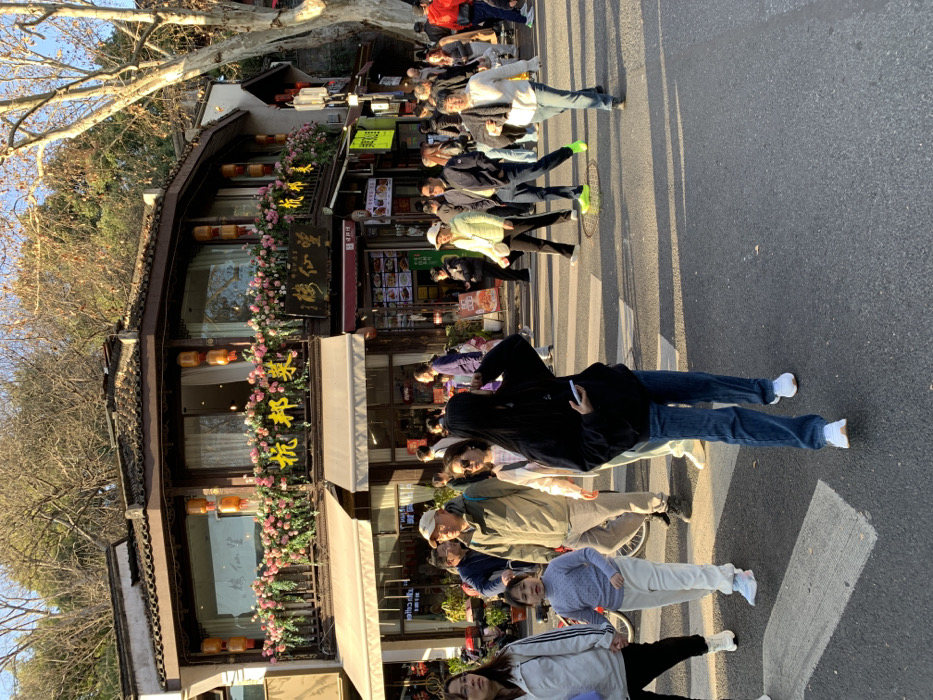 The image depicts a busy street scene in Shangcheng District, China, under clear, late afternoon sunlight. A traditional two-story building with a tiled roof and dark wood framing dominates the background. Its upper floor features multiple windows, adorned with strings of pink flowers, green foliage, and several orange Chinese lanterns. A prominent yellow sign with Chinese characters reads "杭邦菓" on the second-floor facade, with additional Chinese text on other signs. Below, a beige awning covers first-floor storefronts, which display various items. Bare trees with sparse branches are visible behind and to the right of the building, indicating a cooler season. A diverse group of approximately 20-30 pedestrians, predominantly adults, fills the paved street and sidewalk. Many individuals are crossing a clearly marked pedestrian crosswalk in the foreground. On the left, a young girl in a light blue sweater and white pants holds hands with an adult woman in a white jacket and black pants, both walking from left to right. To their right, an adult woman in a black hoodie and blue jeans walks away from the camera, holding a white smartphone in her left hand. Behind them, a crowd moves in various directions; notable individuals include a man in a light green jacket and a woman in a light yellow jacket. Shadows from the people and objects are long and extend across the street, consistent with a low sun angle. A bicycle is partially visible on the left side of the frame near the sidewalk. The scene conveys active urban pedestrian movement.