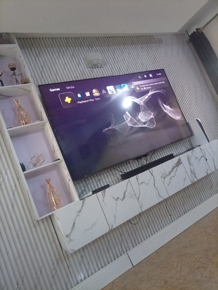 The image depicts an indoor entertainment area. The specific location within Jos, Nigeria, cannot be determined from the visual information provided. A large, black flat-screen television is centrally mounted on a wall featuring light-colored, vertical ribbed paneling. The TV screen displays a PlayStation interface with "Games" and "Media" tabs, icons for various games and applications, "PlayStation Plus | Extra," and a system notification at the top right corner stating "To take over control, press and hold the O button" alongside a timestamp "14:46." Below the television, a white, wall-mounted entertainment unit with a gray marble-effect pattern extends horizontally. This unit comprises a long base cabinet with multiple concealed storage compartments and an integrated, open shelving unit on the left side. A black soundbar rests on the base cabinet directly beneath the TV. Visible electrical cables are present behind and below the TV and soundbar. The shelving unit contains decorative objects: two stylized metallic figures, one appearing as two abstract human forms and another as a geometric cage, on the upper shelves. Two gold-colored, abstract, wire-frame, vase-like sculptures are on the lower shelves. A small, circular, white wall-mounted light fixture is situated on the ribbed wall above the TV. A dark curtain or blind is partially visible at the far right edge of the frame, near the ceiling. The floor, partially visible at the bottom right, is tiled in a light brown or beige color. No people are visible in the scene.