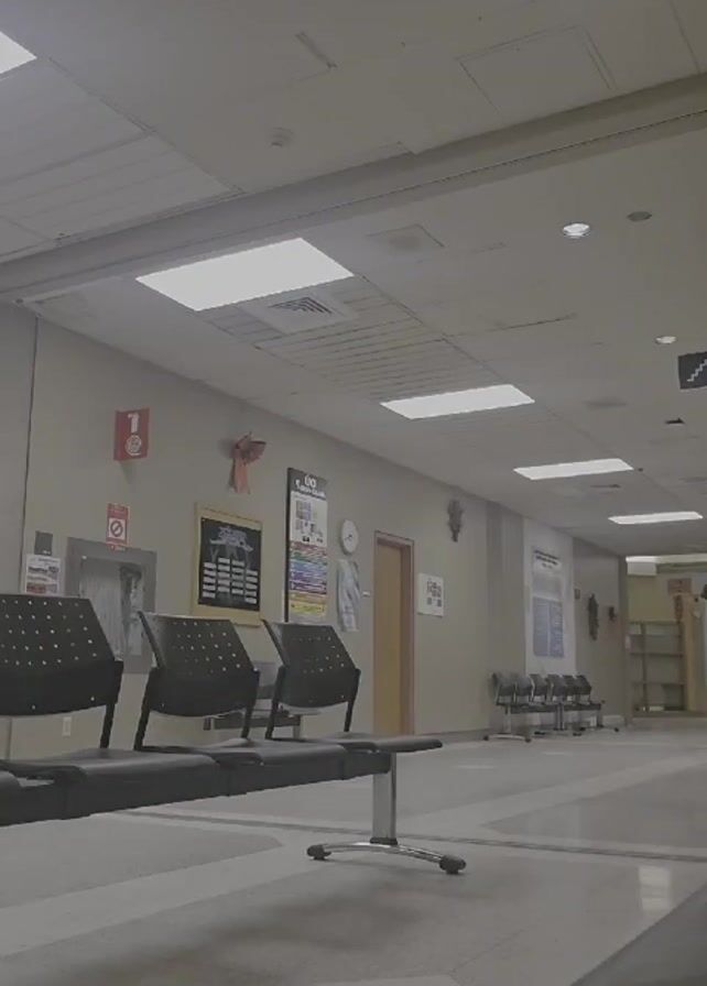 person walking through a sterile, empty waiting area. The individual, dressed in a dark jacket, dark pants, and dark boots, moves from right to left across the frame. The room is brightly lit with fluorescent lights embedded in the ceiling. There are rows of connected black chairs on both sides of the walkway. The walls are painted a neutral color and adorned with various posters and informational signs. A door is visible in the background.