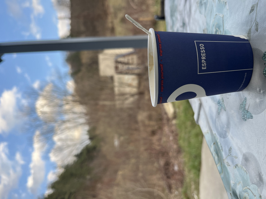 - "The image depicts a close-up, slightly elevated perspective of a dark blue paper espresso cup with a white stirring stick, positioned on a light-colored patterned surface" by FM-UqHze2, licensed under CC BY 4.0