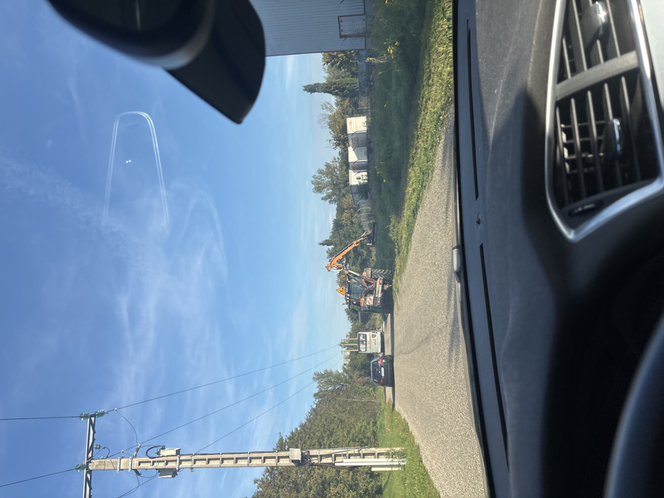 The image captures a daylight scene from within a vehicle in Scherwiller, France, looking forward down a narrow, paved road. The sky is predominantly blue with sparse white clouds and two distinct airplane contrails in the upper right, one forming a U-shape, within which two small circular reflections or objects are visible. A black object, likely a vehicle interior component, partially obstructs the upper right sky. In the foreground, the dark dashboard and a segment of the steering wheel are visible, along with air vents on the right. A utility pole with power lines and a transformer stands vertically on the left side of the road. To the left of the road, dense green foliage and trees line the path, with a multi-story building faintly visible through them in the distance. On the right side of the road, an orange and black tractor-like vehicle, equipped with an extended articulated arm featuring a cutting or trimming attachment, is positioned on the grassy shoulder, facing away from the camera. A yellow triangular warning sign with a black exclamation mark is affixed to its rear. Further down the road, a black sedan is stationary, followed by a white bus. The immediate area to the right of the road features green grass and vegetation. Beyond the tractor, several white, container-like structures are visible in a semi-industrial setting, adjacent to a large, light-colored building with a dark roof. Scattered trees, including slender cypresses, populate the background. No individuals are explicitly visible, but the presence of vehicles implies occupants.