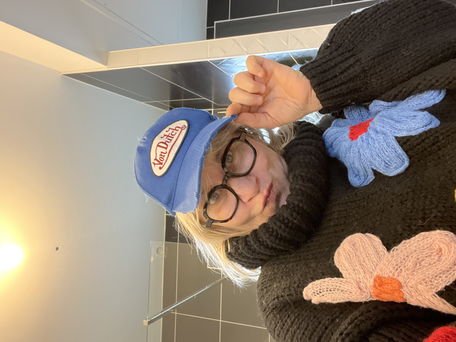An adult individual, appearing female, with blonde hair and dark-framed glasses, is depicted in a close-up, upward-angled selfie taken indoors in Chambœuf, France. The individual wears a distressed blue "Von Dutch" baseball cap and a thick, black knit turtleneck sweater adorned with large, colorful knitted flower appliques. The right hand lightly grips the brim of the cap. The individual's lips are slightly pursed, and the gaze is directed towards the camera. The background consists of dark grey or black rectangular wall tiles with white grout lines, a reflective surface or glass panel on the left, and a white ceiling with a single bright light fixture at the top center. White trim or molding is visible on the right side of the frame.