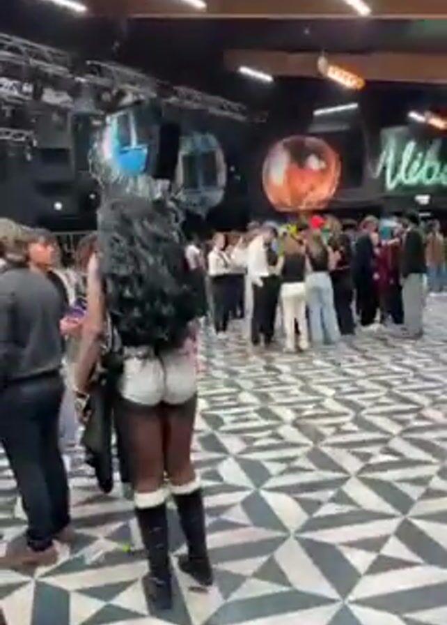 busy indoor event with a mix of people. The space has a geometric patterned floor, with a stage and lighting visible in the background. Many attendees are walking around, some conversing, and others heading towards an exit. The general atmosphere seems lively and crowded.