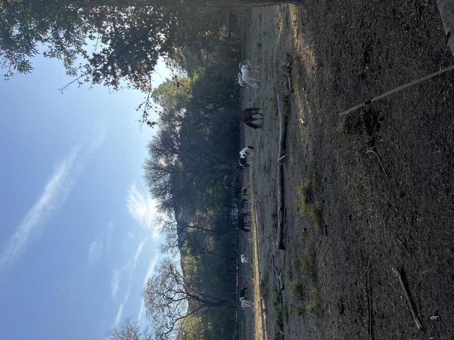 A landscape featuring a herd of horses grazing in a sunlit field. Some horses are white, brown, and piebald. The field has sparse vegetation and fallen logs. Trees border the field, leading to a forest in the background. A clear blue sky with scattered clouds is visible above the trees. The image has a slightly tilted perspective.