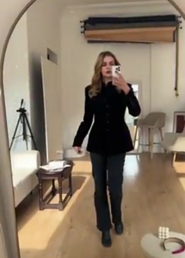 woman standing in front of a large, arched mirror taking a selfie. She is wearing a black velvet jacket with buttons down the front and dark pants. The room is well-lit with hardwood floors and white walls. In the background, there is a white sofa, a small table, a tripod, and a kitchen-style bar with stools. A decorative chandelier hangs from the ceiling. The woman is holding a smartphone and adjusting her hair as she takes the photo.