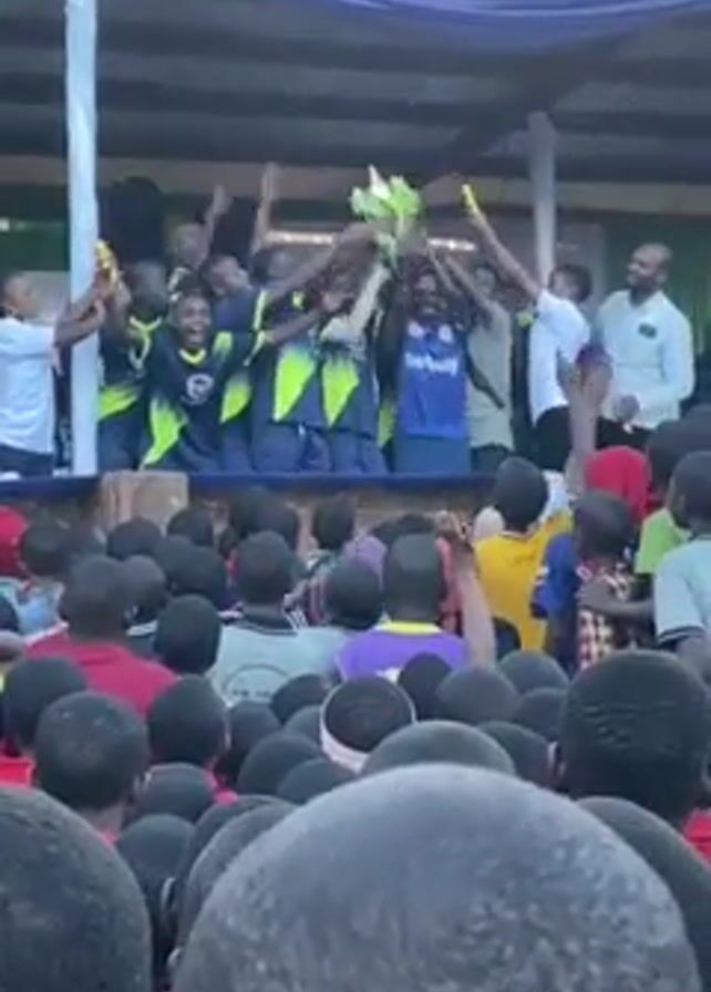 A crowd of people, mostly children, is gathered in an outdoor space. In the foreground are the backs of many heads. In the background, a group of young people are on a raised platform, presumably a stage. They are wearing soccer uniforms in blue and yellow. One person is wearing a Real Madrid soccer jersey. The people on the stage are raising a trophy and there is confetti being thrown into the air. There is a blue and white cloth draped over the stage. A person is standing on the side of the stage holding up a piece of paper. The people are cheering and celebrating.