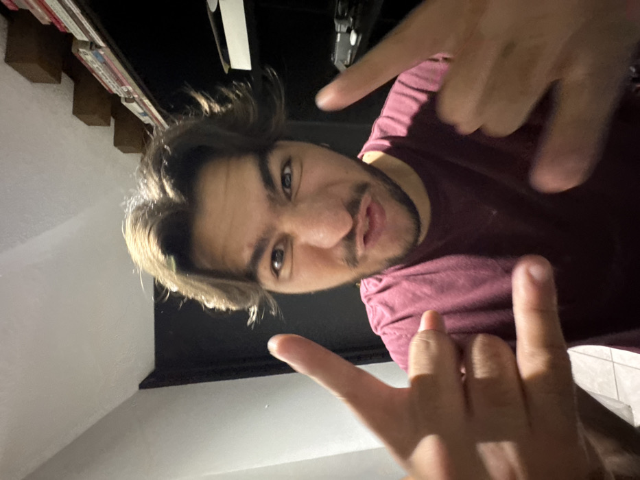 A man with dark hair and a short beard looks down at the camera, holding up his hands in rock-and-roll gestures. He is wearing a maroon shirt. A ceiling with wooden features and a light fixture is visible in the background, along with a white wall. The shot appears to be taken from below, looking upwards at the man's face and hand gestures.