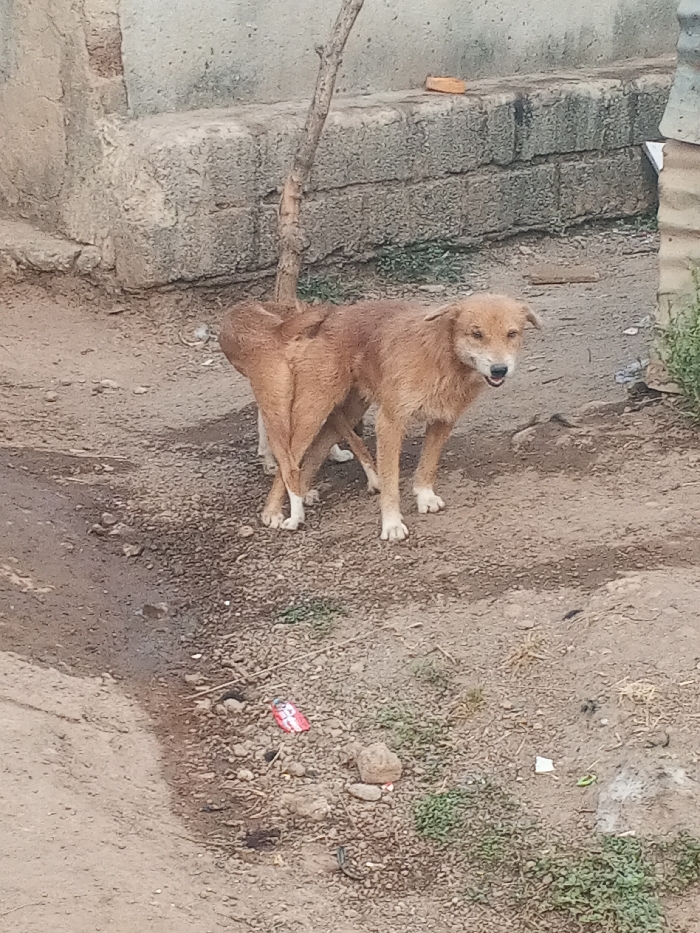 Two light brown dogs stand on dry, cracked ground with sparse vegetation. One dog faces forward, its mouth slightly open. The other dog is positioned behind it, with only its hindquarters visible. A concrete structure with exposed bricks forms the backdrop, and a thin, leafless tree branch extends upwards nearby. Litter and small rocks are scattered on the ground.