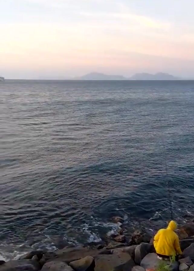 person fishing by the sea at dusk. The person is wearing a bright yellow hooded jacket and is sitting on large rocks near the water's edge. They are holding a fishing rod. The sea is calm with small waves, and in the distance, a white boat moves across the water. The sky is a mix of blue and pink hues, indicating either sunrise or sunset. Green vegetation is visible near the rocks in the foreground.